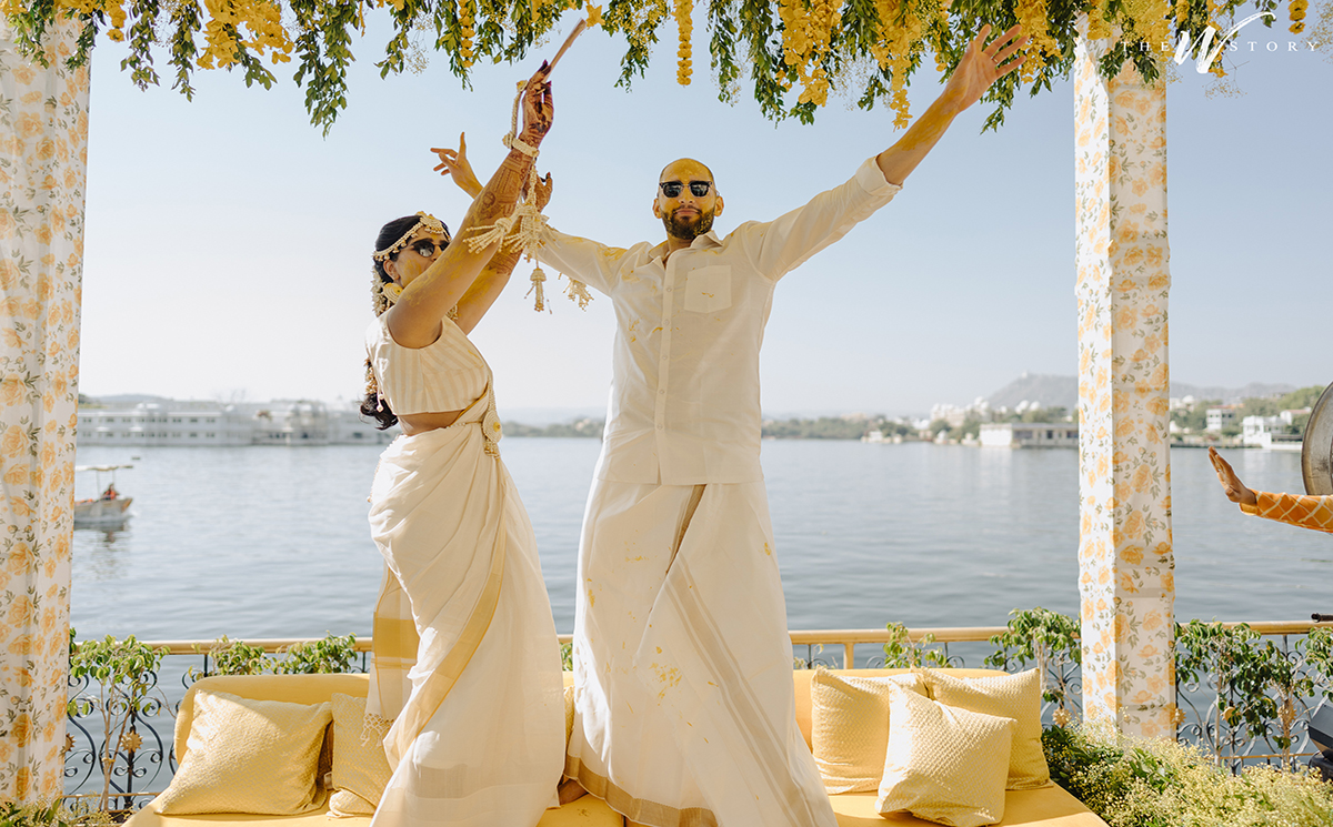 Anu and Sunder's Haldi ceremony was a special gathering by the lakeside, filled with warmth and joy. The decor was simple yet meaningful, with a cozy seating area surrounded by yellow marigold flowers. This setting brought a sense of comfort and tradition to the celebration. The backdrop of the calm lake and distant hills created a peaceful atmosphere. The ground was covered with marigold petals, adding a touch of nature to the space. Small details, like the flower arrangements and greenery, added a personal touch to the event.